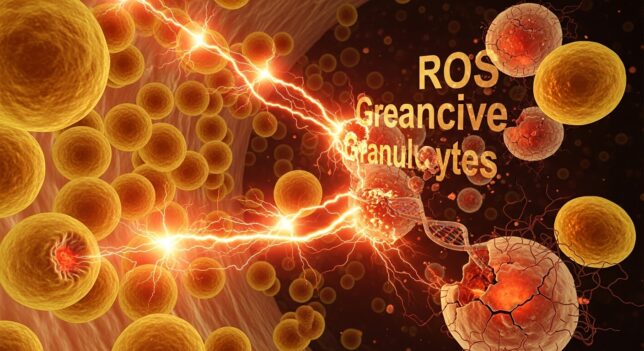 次に、顆粒球という白血球の一種が増加します。顆粒球は細菌などと闘う重要な役割を持っていますが、増えすぎると活性酸素を大量に発生させてしまいます。この活性酸素が正常な細胞を攻撃し、DNAを傷つけ、炎症を引き起こすのです。